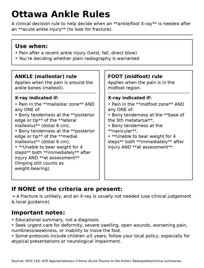 The Ottawa Ankle Rules (OAR) are a set of clinical decision rules used after an acute ankle or midfoot injury to decide who needs X-rays to look for a fracture. Their goal is to reduce unnecessary radiographs while maintaining a very low miss rate for clinically important fractures. Spital Mures+1